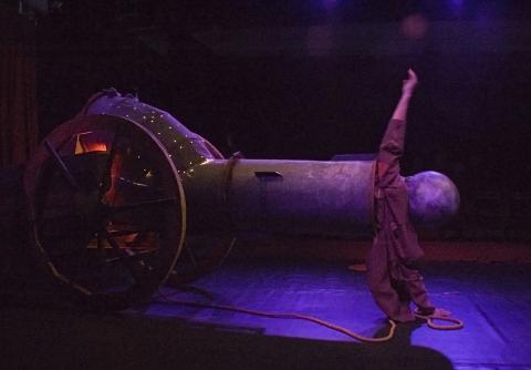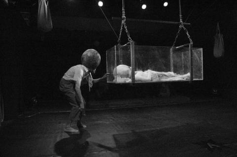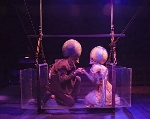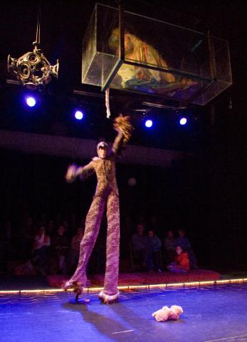 De langste toegangsgang naar een theaterarena, dertien wonderlijke personages, talrijke bizarre apparaten en geprojecteerde animaties vertellen zonder gesproken woord een ingewikkeld verhaal over een onechte wereld waarin ware liefde een uitweg zoekt. Achter de horizon schijnt de zon!