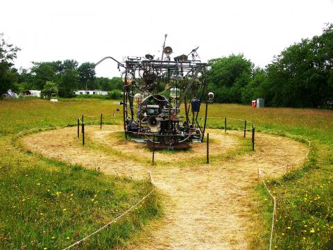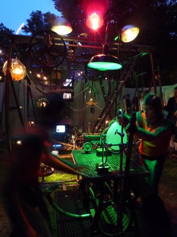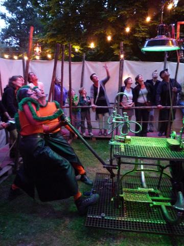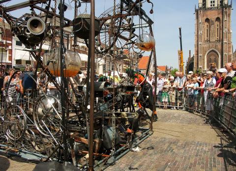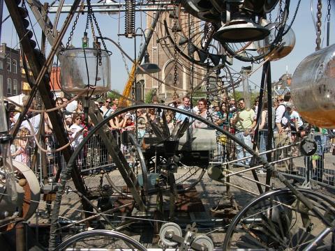 Twee zonderlinge figuren presenteren een wonderlijke machine, opgebouwd uit talloze piepende en knarsende, door elkaar dansende objecten.