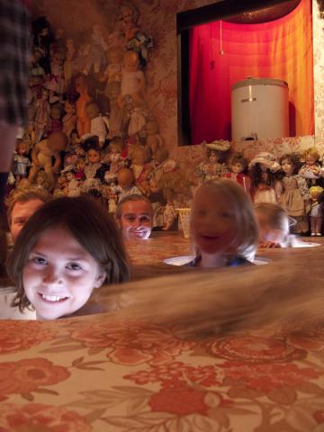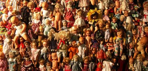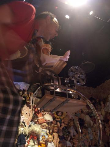 Honderden speelgoedpoppen vormen het decor van een kleurrijke kijkdoosvoorstelling.